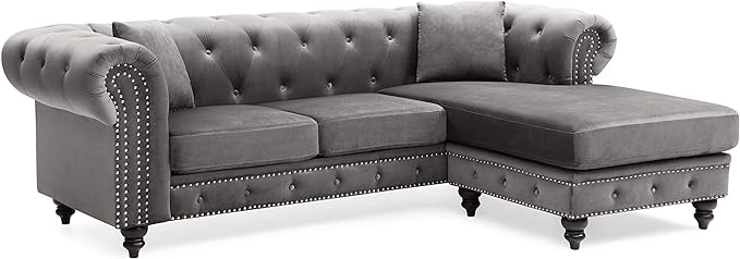 This Chesterfield sectional is a statement piece with tufted velvet detailing on the front, back, and bottom rail. Its timeless design adds elegance to any space, while the pocketed coil seating ensures comfort and durability. Available in multiple colors to suit various decor styles.