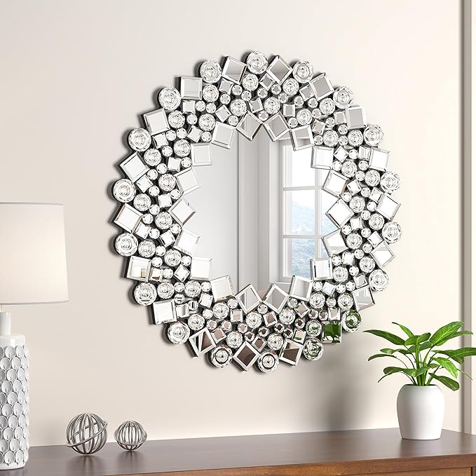 With its exquisite design and high-quality craftsmanship, this 23” round crystal mirror enhances your home with a royal vibe, suitable for any modern space. Easy to hang and built to last.